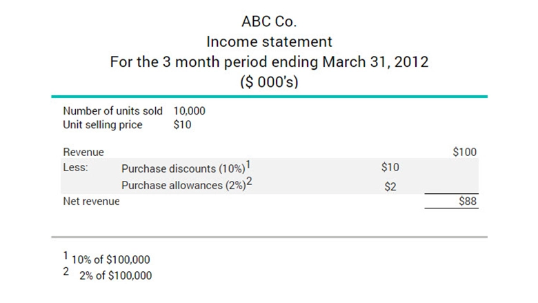 The excerpt below shows how purchase discounts and allowances are deducted from gross revenue on the income statement of a retail or wholesale company. In this case, ABC Company sells 10,000 units of its product at $10 each, with a 10% purchase discount and a 2% purchase allowance for customers.