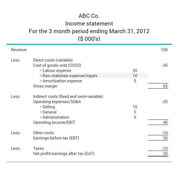 The excerpt below shows how raw material expenses appear on a manufacturing company’s income statement. At $10,000 they represent 28.5% of the costs of goods sold.