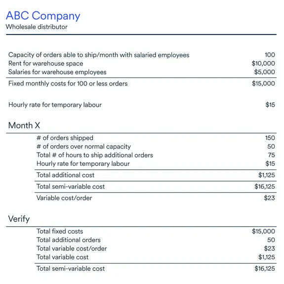 You can see a detailed example, below, of the calculation involved in obtaining the semi-variable cost per order.