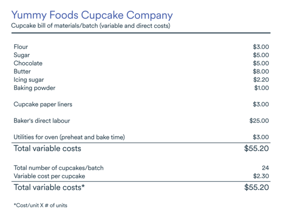 Below is a numerical example showing how to calculate the total variable cost as well as the variable cost per unit for a fictional cupcake company. The costs are listed on the firm’s bill of materials.