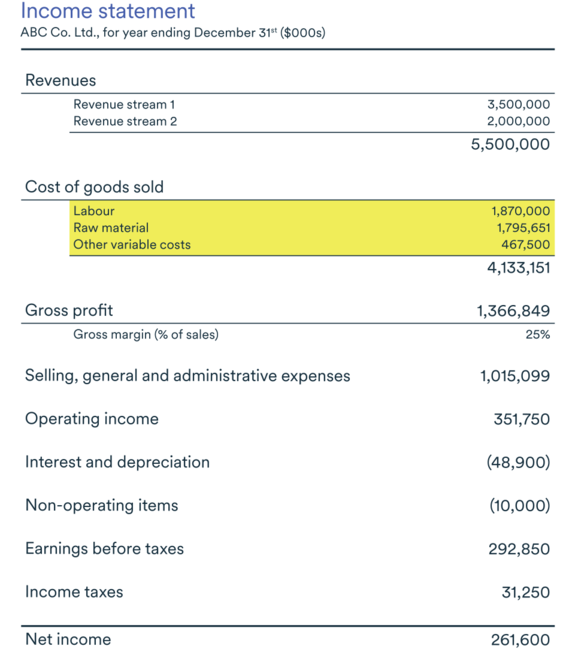 Variable costs generally appear on an income statement under cost of goods sold (COGS) or cost of sales, as highlighted in the image below.