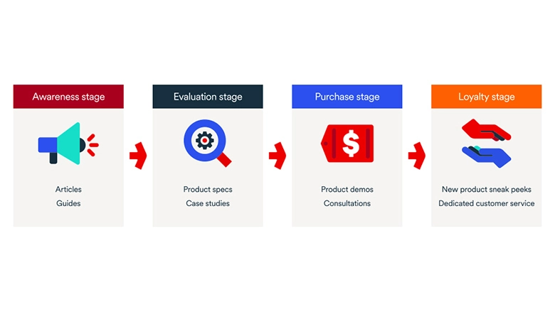 There are opportunities for lead nurturing throughout every stage of a customer journey. “Once you’ve mapped out your process, you can start to think about how to nurture them from one stage to the next,” Turner says.