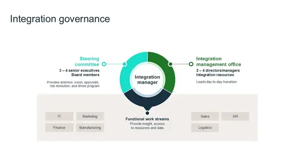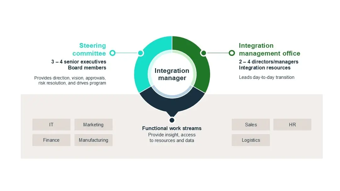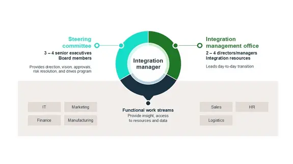 Integration managers usually lead a small team called the integration management office, which oversees the daily process of joining the two companies. Integration managers help connect the big-picture plans from top bosses and board members (in smaller firms, this can be just the CEO and a couple of senior leaders) with the people who execute the work, like sales, IT and other departments. The integration manager ensures leadership goals are implemented in daily operations.