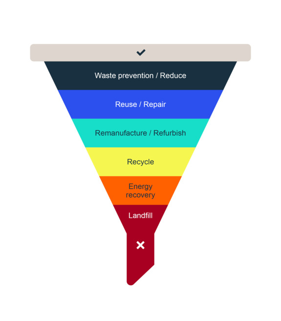 Reuse, recycle, and recover materials whenever possible. Start by cutting down on waste, then reuse items when you can, recycle what’s left, and think about turning any leftover waste into energy. The waste hierarchy shows these options in order of preference, from most preferred to least preferred.