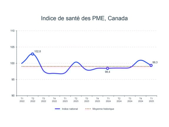 L’indice national a dépassé 100 à la fin de 2024 en raison de l’amélioration du paysage économique. Cependant, l’incertitude engendrée par les tensions commerciales avec les États-Unis et la Chine l’a fait revenir à sa moyenne historique. Au T1 2025, l’indice national s’est établi à 99,3, en baisse de 1,5% par rapport au trimestre précédent, mais tout de même en hausse de 0,9% par rapport au T1 2024. Malgré un environnement d’affaires généralement meilleur et une hausse de la confiance depuis l’année dernière, les PME sont encore aux prises avec des difficultés financières. L’incertitude économique brouille les perspectives pour les prochains mois.