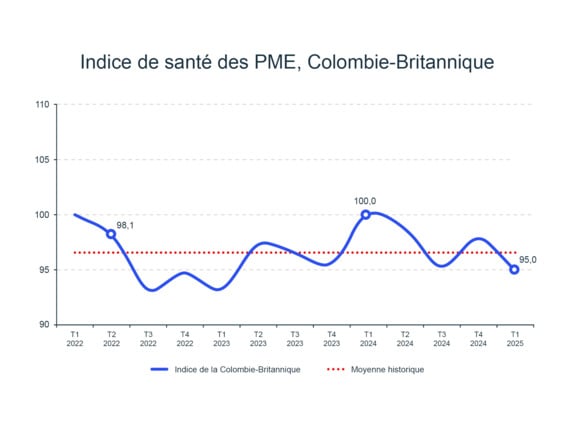 L’indice de la Colombie-Britannique était le moins élevé des indices régionaux au dernier trimestre. Même s’il a monté légèrement à la fin de 2024, à 97,8, il a depuis baissé sous sa moyenne, à 95,0.