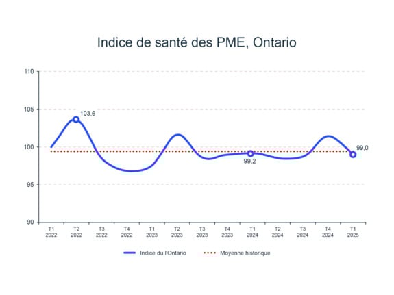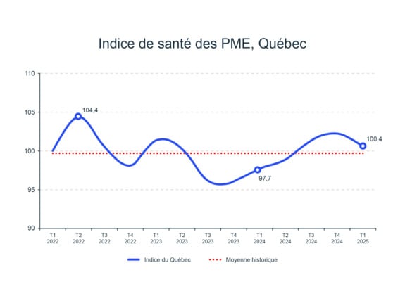La santé des entreprises au Québec est revenue à ses niveaux moyens au T1 2025. Dans l’ensemble, l’indice du Québec s’établissait à 100,4, en hausse de 2,8% par rapport au T1 2024. Mais il a baissé de 1,7% par rapport au trimestre précédent, ce qui laisse à penser que les droits de douane et l’incertitude économique croissante ont fait ressentir leurs effets tôt dans l’année.