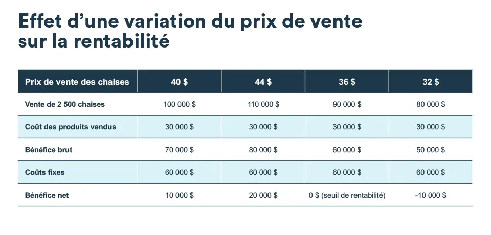 Dans l’exemple ci-dessous, nous pouvons voir qu’une hausse de plus de 2 $ pourrait engendrer des pertes pour l’entreprise.