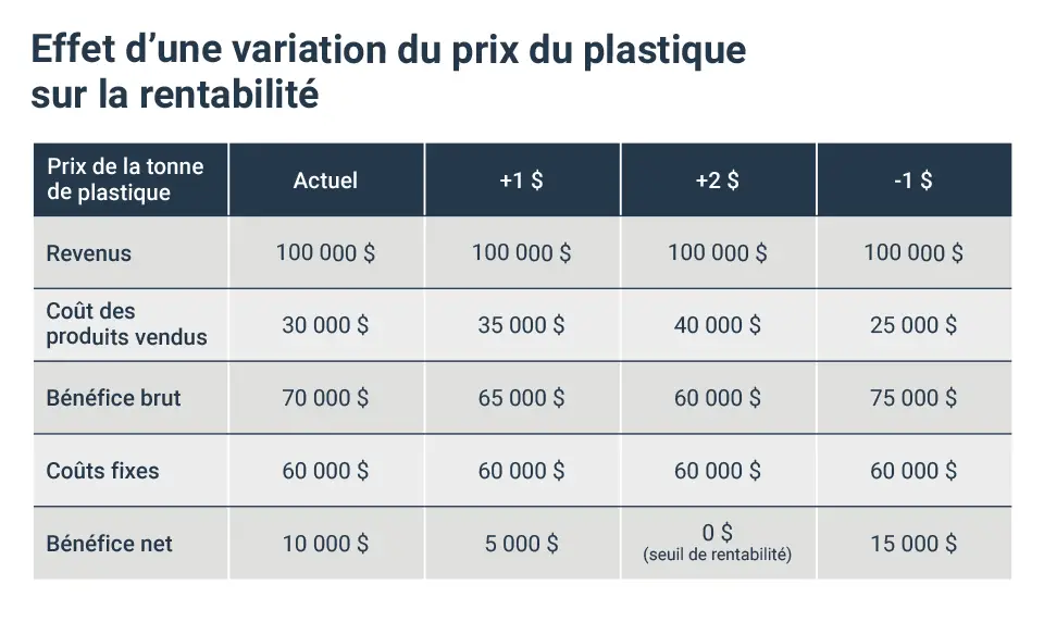 Prenons l’exemple de l’entreprise de fabrication de chaises de plastique. Puisque le prix de la tonne de plastique a un grand impact sur la rentabilité de l’entreprise, il est important d’examiner différentes variations. Par exemple, on peut analyser l’effet d’une hausse ou d’une baisse de 1 $ du prix de la tonne de plastique.
