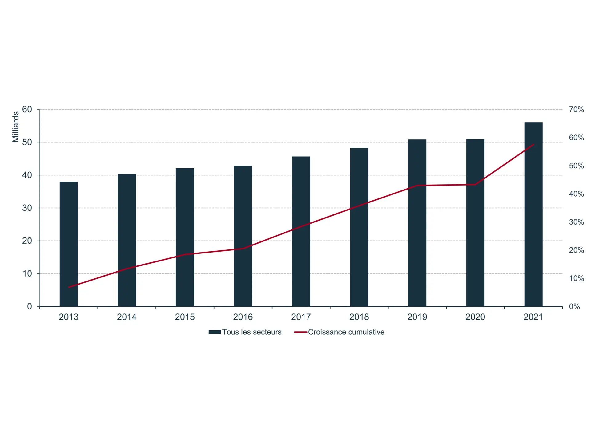Grille de lecture: Ce graphique montre que le revenu intérieur brut attribuable à l’économie autochtone au Canada est passé de 38 milliards à 56 milliards de dollars, ce qui représente une hausse de 58 % par rapport à 2012.