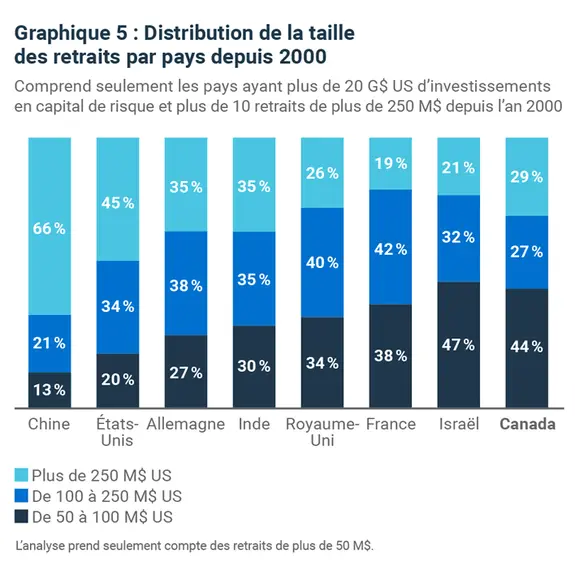 Nous constatons que si les méga-écosystèmes du capital de risque de la Chine et des États-Unis présentent un nombre nettement plus élevé de retraits supérieurs à 250 millions de dollars américains, l’inverse est vrai pour le Canada, où les retraits se situent principalement dans la fourchette de 50 à 100 millions de dollars américains.