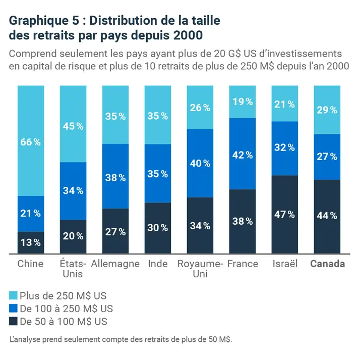 Si l’on réduit le point de référence pour la réussite, le Canada semble obtenir de meilleurs résultats que les autres grands écosystèmes de capital de risque. Si la mesure du succès d’un retrait est fixée à plus de 50 millions de dollars américains, le taux de réussite du Canada n’est que deux fois inférieur à celui des États-Unis.
