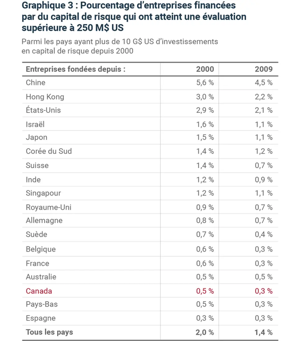 Le graphique 3 présente le pourcentage des entreprises dans chacun des pays fondées au cours des 20 dernières années dont la valeur dépasse maintenant 250 millions de dollars américains (aux fins de cette analyse, appelons-les des Connaissez-vous réussites»2).