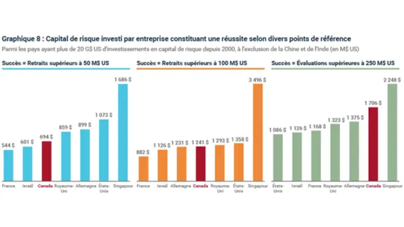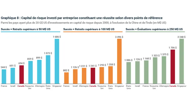 Qui plus est, l’efficacité de notre écosystème de capital de risque serait de calibre mondial. Lorsque nous utilisons un point de référence de plus de 50 millions de dollars américains pour les retraits, nous sommes presque 60 % plus efficaces que les États-Unis. Seuls Israël et la France sont plus efficaces.