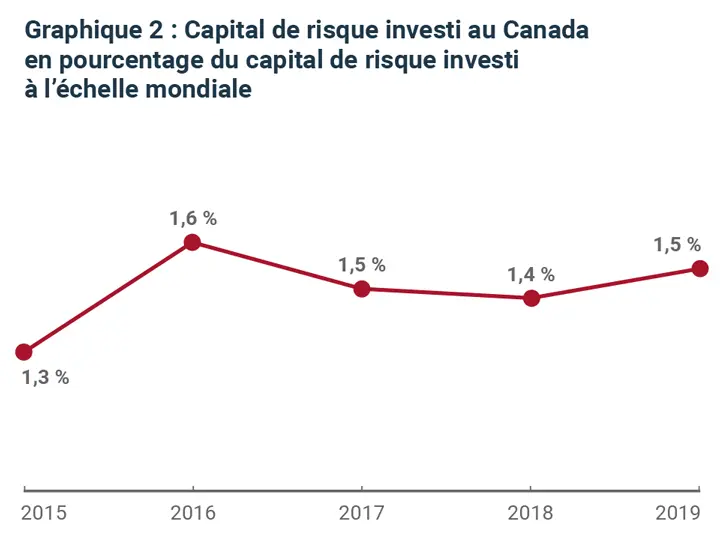 Pour commencer, nous avons examiné la performance de l’écosystème canadien du capital de risque par rapport à celle d’autres grands écosystèmes. Nous sommes très fiers des niveaux records d’investissement en capital de risque au Canada en 2019 (graphique 1), mais nous comprenons aussi qu’ils découlent en grande partie des investissements croissants dans l’écosystème mondial du capital de risque (graphique 2).
