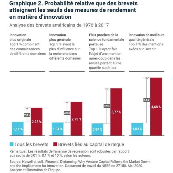 De plus, si l’on se fie à la plupart des mesures, l’innovation réalisée par les entreprises financées par du capital de risque est plus fondamentale et de meilleure qualité. Par exemple, une analyse de la qualité des brevets montre que les entreprises financées par du capital de risque ont nettement mieux innové que celles qui ne le sont pas (graphique 2).