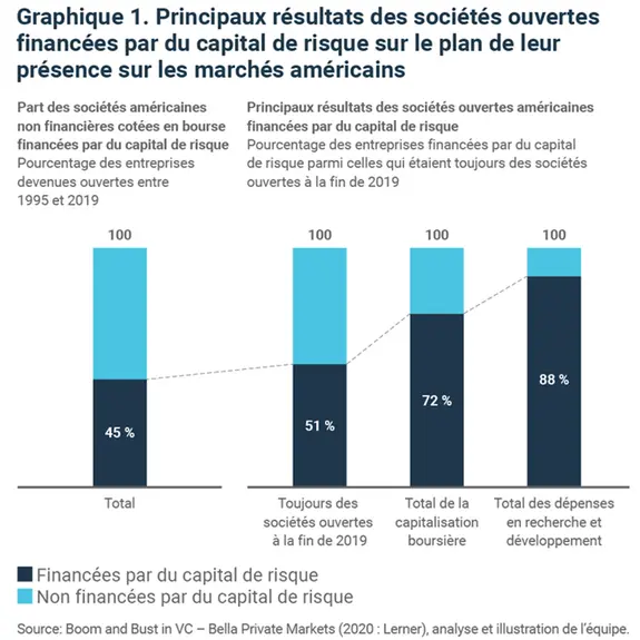 On peut constater à quel point ce rôle est important lorsque l’on compare le rendement supérieur des entreprises financées par du capital de risque à celui des entreprises qui ne le sont pas. Par exemple, les entreprises soutenues par du capital de risque représentent une part disproportionnée de la capitalisation boursière et des dépenses en recherche et développement aux États-Unis (graphique 1).