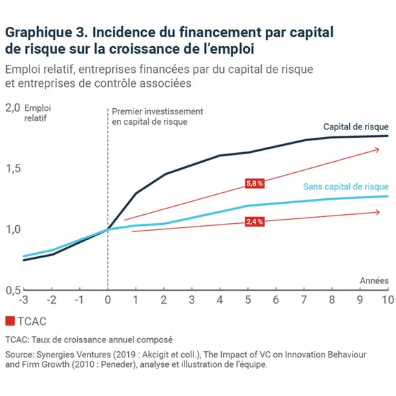 En ce qui concerne la création d’emplois, le taux de croissance annuel composé de l’emploi des entreprises financées par du capital de risque est supérieur de 2,4 % à celui des entreprises non financées par du capital de risque (graphique 3).