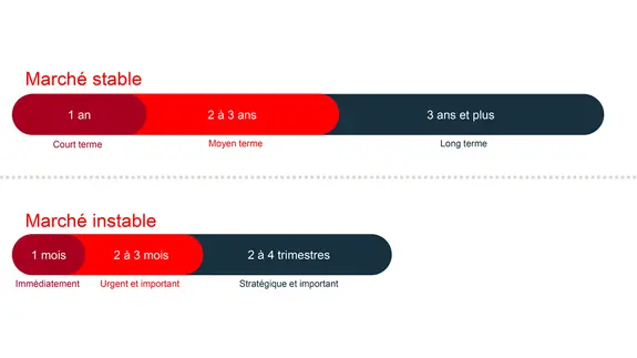 Dans un cycle d’entreprise normal, vous comprenez clairement la situation dans laquelle vous vous trouvez, car elle change relativement peu. Vous pouvez planifier avec confiance pour l’année qui vient, tandis que votre plan à moyen terme contiendra plus d’hypothèses et que votre plan à long terme reposera davantage sur des analyses des tendances.