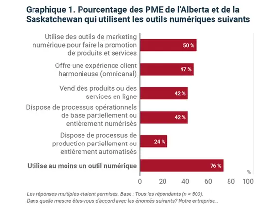 Notre sondage auprès de 500 propriétaires et décideuses et décideurs de petites et moyennes entreprises en Alberta et en Saskatchewan a révélé que plus des trois quarts d’entre elles et eux utilisent déjà au moins un type de technologie numérique. Les outils de marketing étaient les plus populaires, suivis de la création d’une expérience client omnicanal et de la vente de produits et services en ligne (graphique 1).
