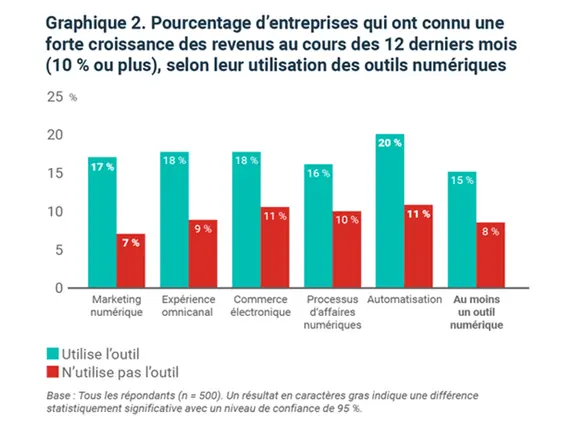 85 % des entreprises qui ont enregistré une forte croissance des revenus (plus de 10 %) au cours de l’année précédente utilisaient au moins une technologie numérique.