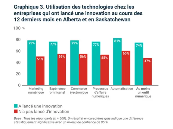 Entre-temps, notre sondage auprès des propriétaires d’entreprise de l’Alberta et de la Saskatchewan indique que l’utilisation des technologies numériques est associée non seulement à une croissance plus forte, mais aussi à plus d’innovation.