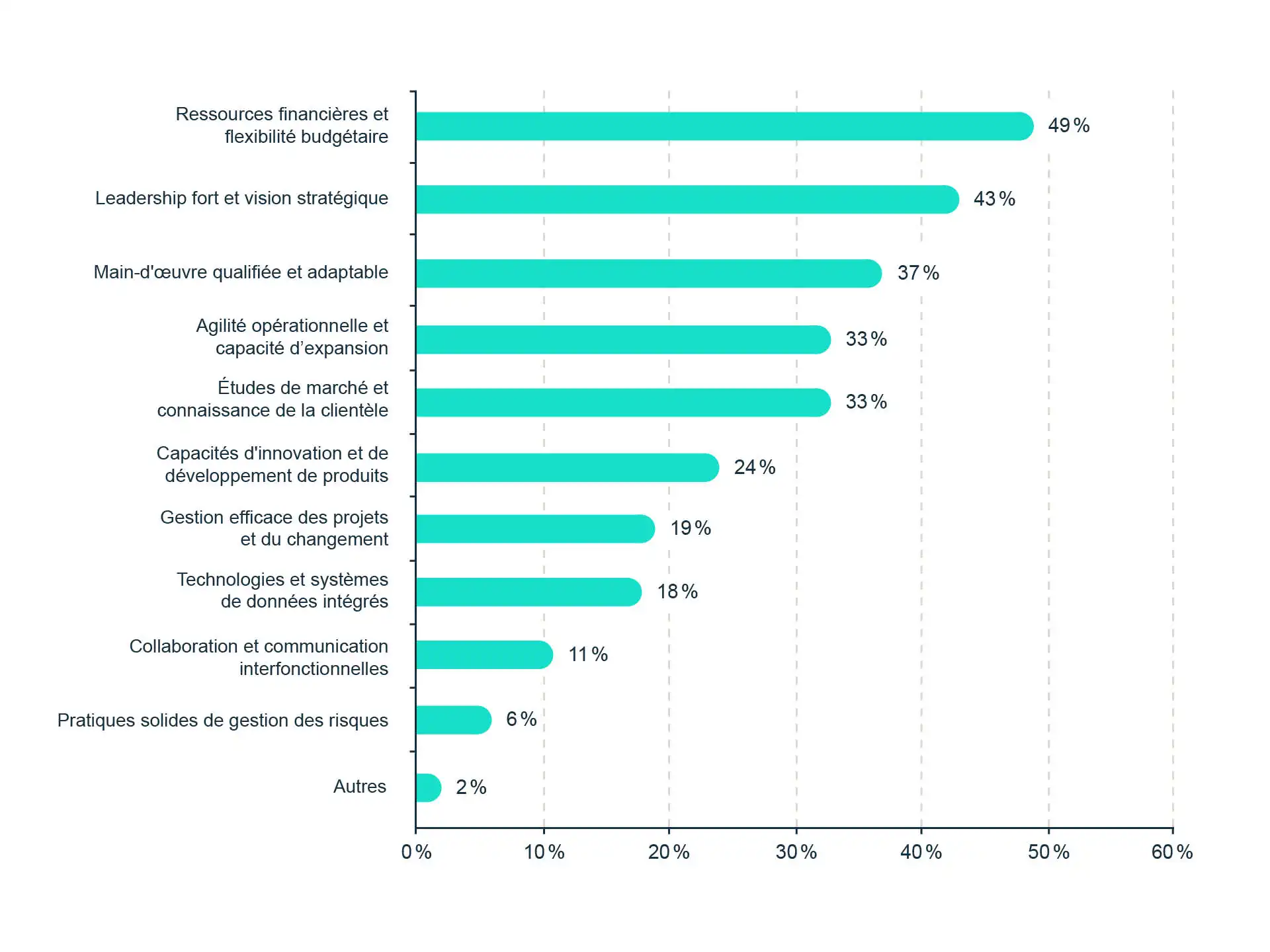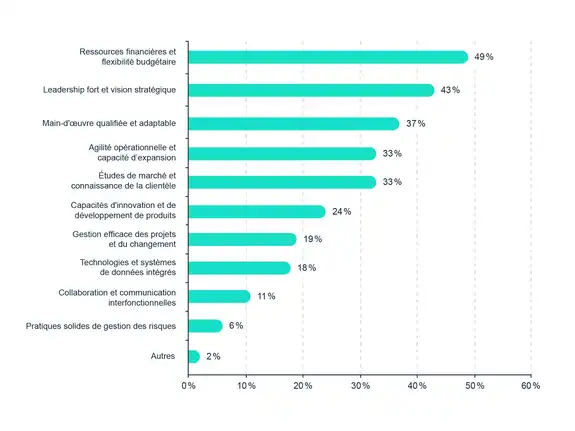 D’autres facteurs internes sont également jugés essentiels, quoique dans une moindre mesure, comme l’agilité opérationnelle et la capacité à évoluer à plus grande échelle (33 %), de même que la recherche de marché et la compréhension de la clientèle (33 %). Enfin, des aspects comme l’innovation et le développement de nouveaux produits (24 %), la gestion efficace de projets et du changement (19 %), ainsi que l’intégration des technologies et des données (18 %) complètent la liste.