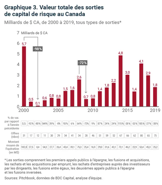 La récession du début des années 2000 et la crise financière de 2007-2009 ont entraîné un net recul des investissements en capital de risque, qui s’est exprimé par des réductions de 30 % à 64 % sur deux à quatre ans. Une chute similaire des investissements serait un revers pour le secteur canadien, qui a connu une année 2019 exceptionnelle. Les 6,5 milliards de dollars d’investissements en 2019 en ont fait de loin la meilleure année jamais enregistrée (graphique 1).