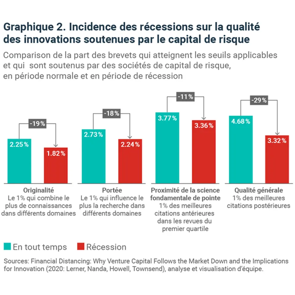 Une analyse de la qualité des brevets démontre qu’en période de récession, les investisseuses et investisseurs en capital de risque ont tendance à soutenir les entreprises qui font preuve de moins d’originalité et ont moins d’influence sur leur secteur et une moins grande proximité avec la science fondamentale. Dans l’ensemble, les recherches démontrent que la qualité générale des innovations des entreprises financées par du capital de risque chute de 29 % lors des récessions (graphique 2).