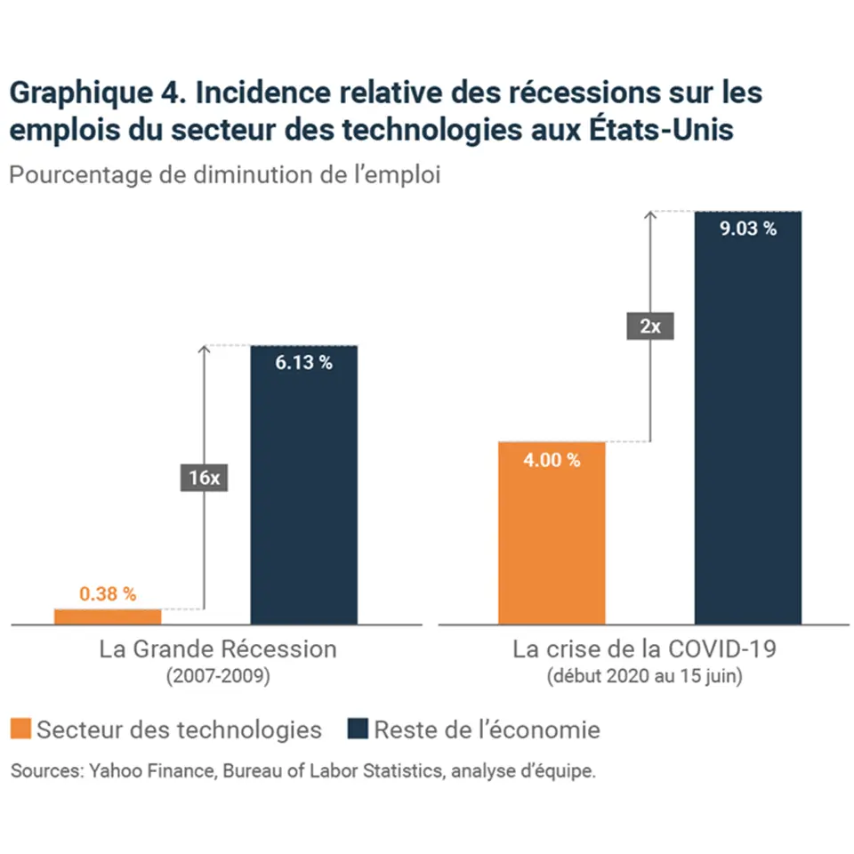 Jusqu’à présent, le secteur des technologies demeure vigoureux durant la pandémie, ce qui constitue un élément positif. Par exemple, l’indice NASDAQ, qui regroupe une forte proportion de sociétés du secteur de la technologie, a dépassé les autres indices boursiers américains. En outre, l’emploi dans le secteur des technologies a su bien résister à la crise de la COVID-19 comme à la Grande Récession de 2007-2009. La croissance rapide du secteur et son importance économique devraient inciter les investisseuses et investisseurs à se projeter dans le long terme (graphique 4).