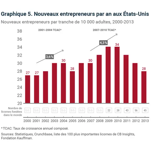 Les périodes de récession et la phase initiale des reprises sont associées à la création d’un grand nombre d’entreprises (graphique 5). Des entreprises de grande influence, telles que LinkedIn, Tesla, Facebook et Shopify, ont toutes été lancées dans le sillage de l’éclatement de la bulle Internet. Airbnb, Uber, Slack et Stripe ont toutes démarré pendant la Grande Récession de 2007-2009.