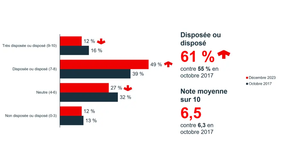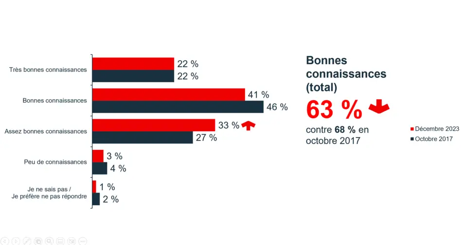 Alors que 68 % estimaient avoir de très bonnes ou de bonnes connaissances en 2017, seulement 63 % ont répondu de la même façon en 2023, un résultat significativement plus faible.