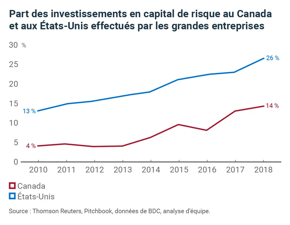Avant la pandémie, les investissements en capital de risque au Canada étaient en expansion et occupaient une part de plus en plus importante dans l’écosystème. Les investissements des grandes entreprises ont tendance à être cycliques; nous ne pouvons pas être certains des effets de la crise, mais il y a un risque que celles-ci freinent leurs investissements.