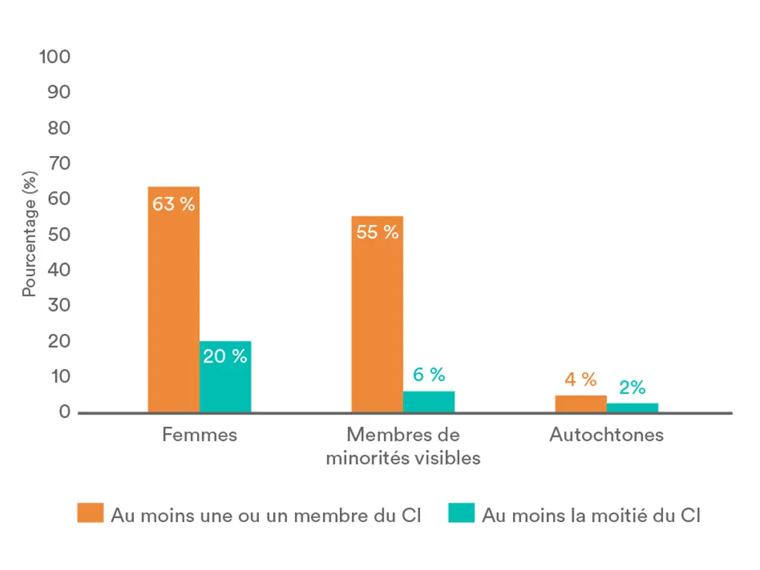 Graphique 4: Pourcentage de sociétés en commandite dont le CI compte des femmes, des membres de minorités visibles et des Autochtones