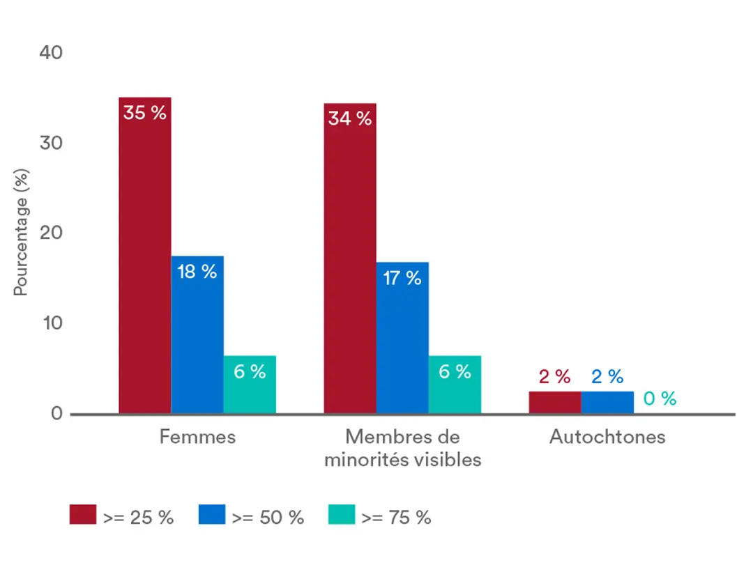 Néanmoins, une tendance claire et récurrente se dégage des données: il existe un manque de diversité aux postes de décision de haut niveau. Seulement 21 % des entreprises atteignent au moins la parité hommes-femmes au sein de l’équipe de direction et 41 % n’ont aucune personne issue d’une minorité visible au sein de l’équipe de direction. Seulement 3 % des sociétés en portefeuille comptent une personne autochtone dans leur équipe de direction.