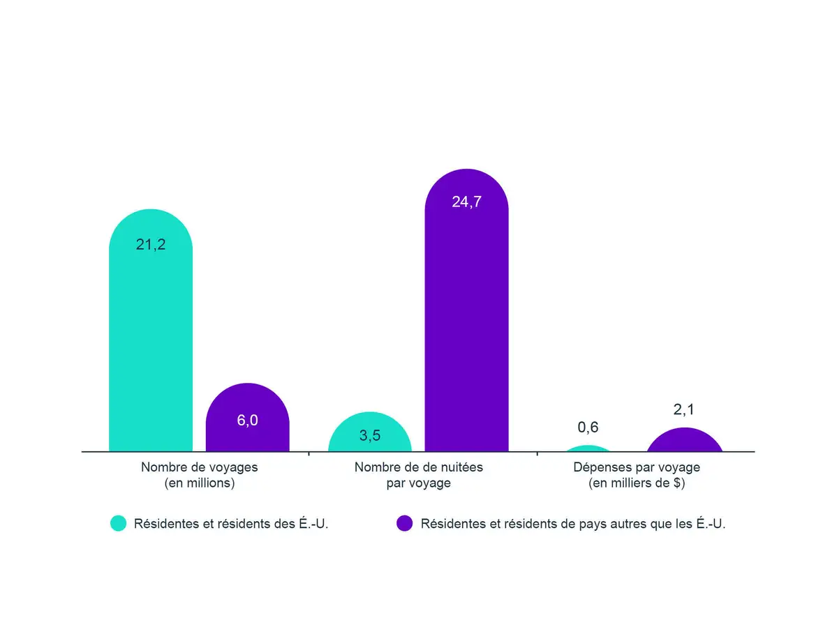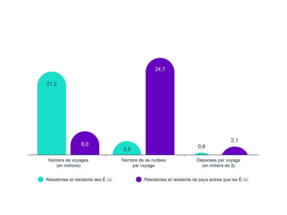 Les résidentes et résidents des É.-U. ont effectué un plus grand nombre de voyages au Canada que les résidentes et résidents de pays autres que les É.-U. Cependant, en moyenne, ils passent moins de temps au Canada et dépensent moins pendant leur séjour.