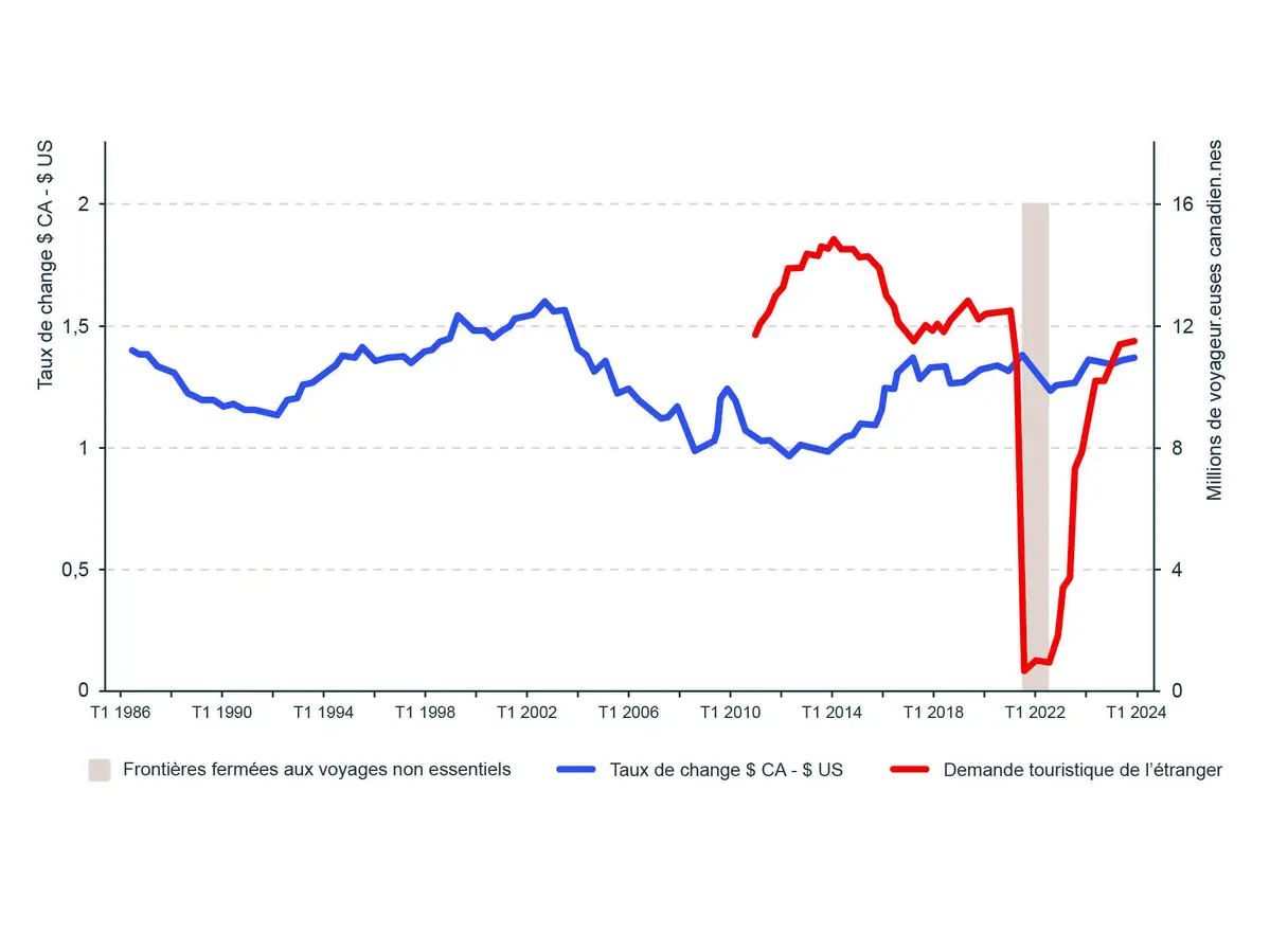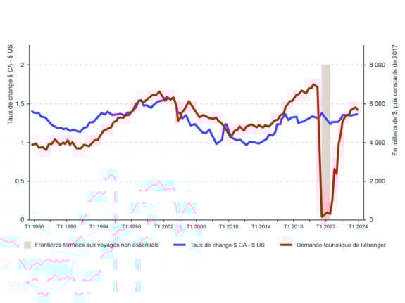 Sources: Statistique Canada. Tableau 36-10-0230-01 Demande touristique au Canada, prix constants (x 1 000 000); Banque du Canada