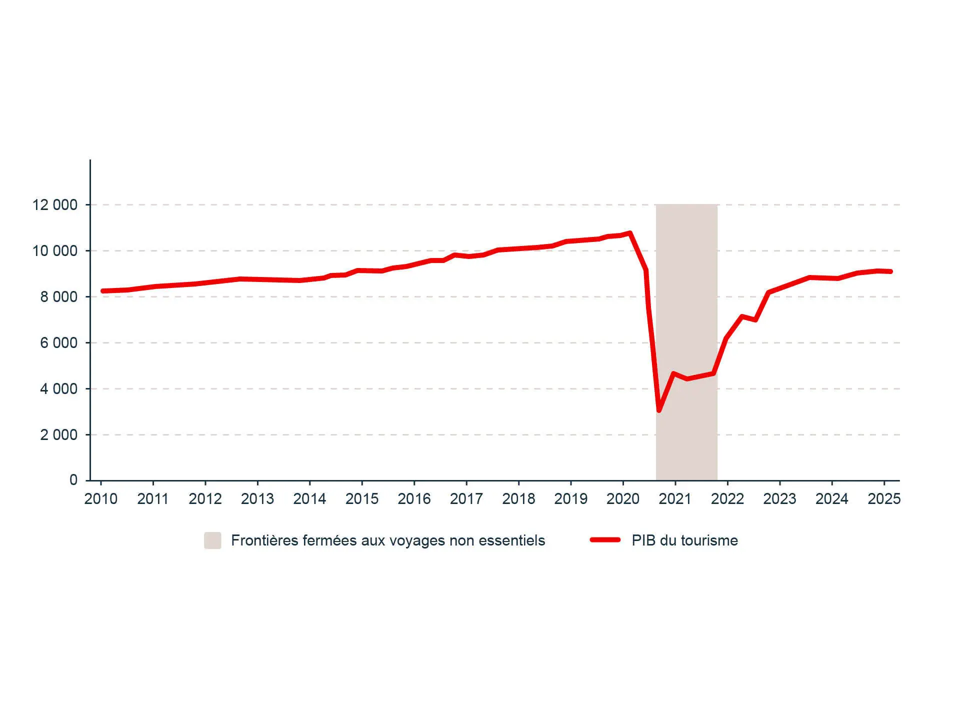 Le secteur touristique a connu une croissance stable pendant une décennie avant la pandémie. Les restrictions sur les voyages liées à la COVID-19 ont eu des répercussions négatives considérables sur le secteur, mais celui-ci se rétablit de façon stable depuis que les voyages ont recommencé.