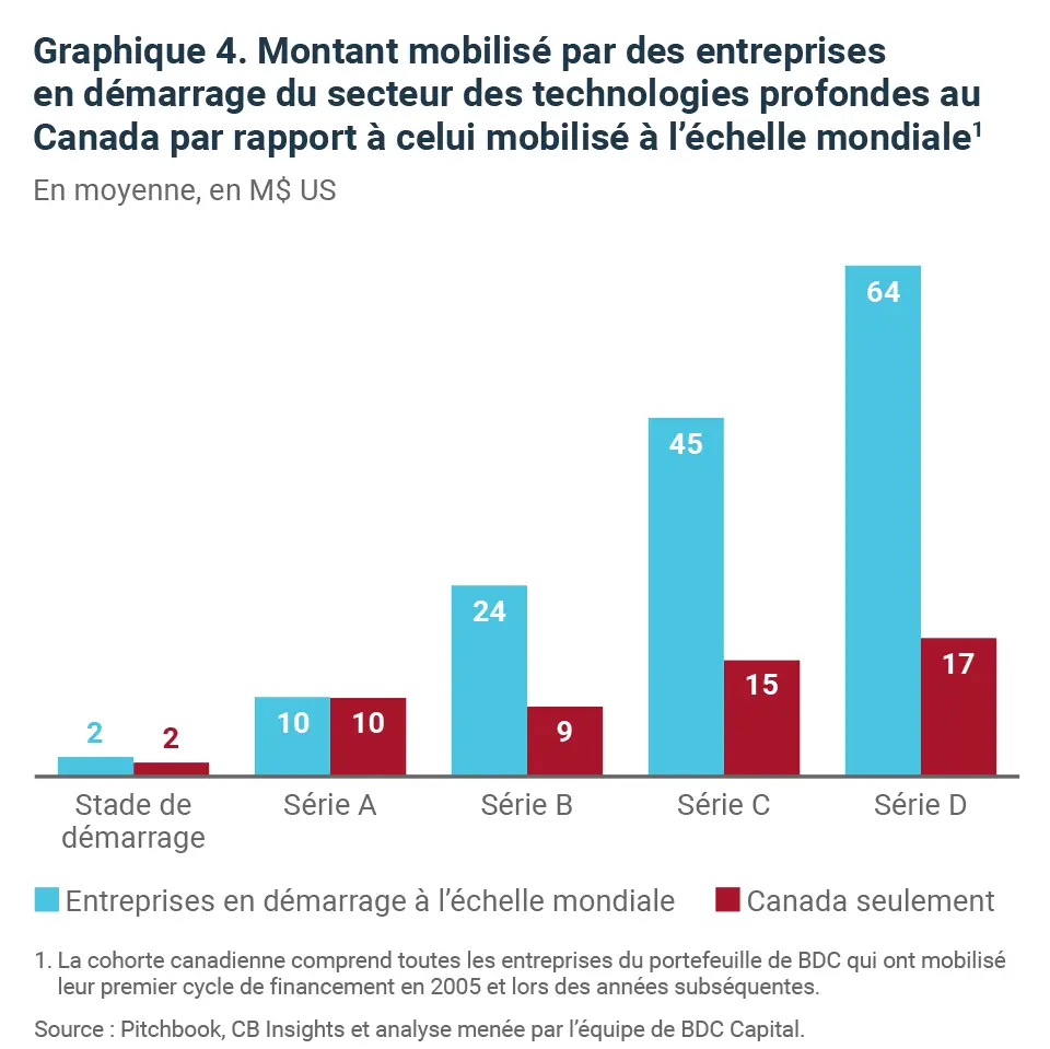 Notre analyse (graphique 4) montre que les entreprises canadiennes de technologie profonde ont tendance à mobiliser des sommes semblables à celles de leurs entreprises paires à l’échelle mondiale au cours des premiers cycles de financement, mais beaucoup moins pendant les stades ultérieurs.