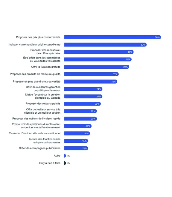 - Lorsqu’on leur a demandé ce que les entreprises canadiennes pouvaient faire pour les inciter à acheter davantage auprès d’elles, les consommatrices et consommateurs ont exprimé clairement leurs préférences: proposer des prix plus concurrentiels et indiquer clairement leur origine canadienne.
