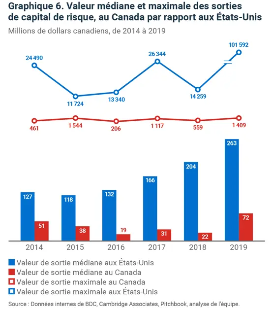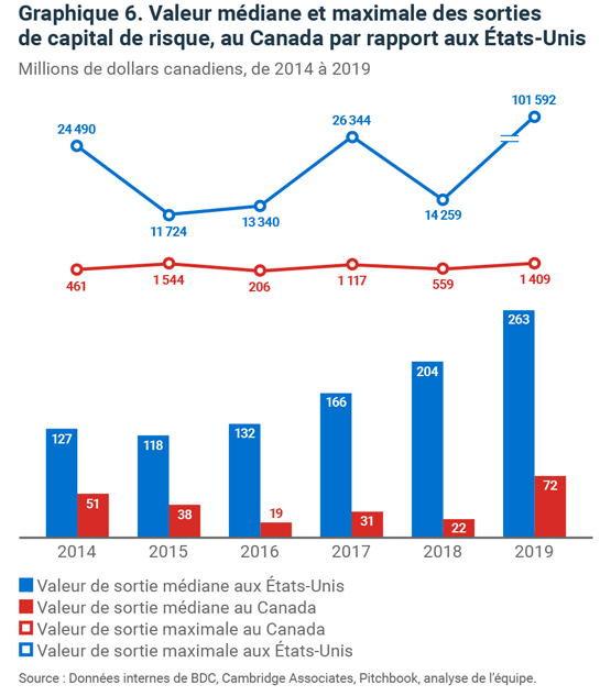 Bien qu’il reste des défis à relever, le secteur canadien du capital de risque a affiché, ces dernières années, des résultats de sortie beaucoup plus solides. Entre 2016 et 2019, la taille médiane de sortie a été multipliée par 3,8 (graphique 6), tandis que, entre 2014 et 2019, le délai entre le premier financement et la sortie a atteint la parité avec les États-Unis.