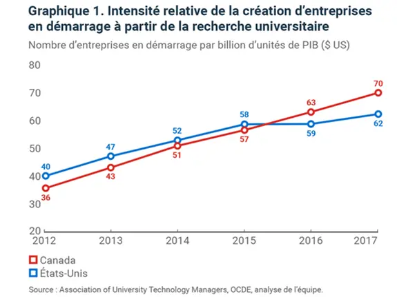 Le Canada est devenu un territoire fertile pour la commercialisation de la recherche universitaire. Le Canada compte des universités de premier ordre qui accueillent une énorme population étudiante diversifiée et un nombre élevé de pépinières d’entreprises de premier plan. Cela a conduit le Canada à dépasser les États-Unis, depuis 2016, en ce qui concerne la conversion de la recherche universitaire en nouvelles entreprises en démarrage (graphique 1).