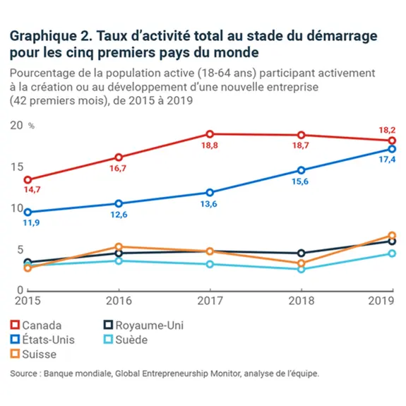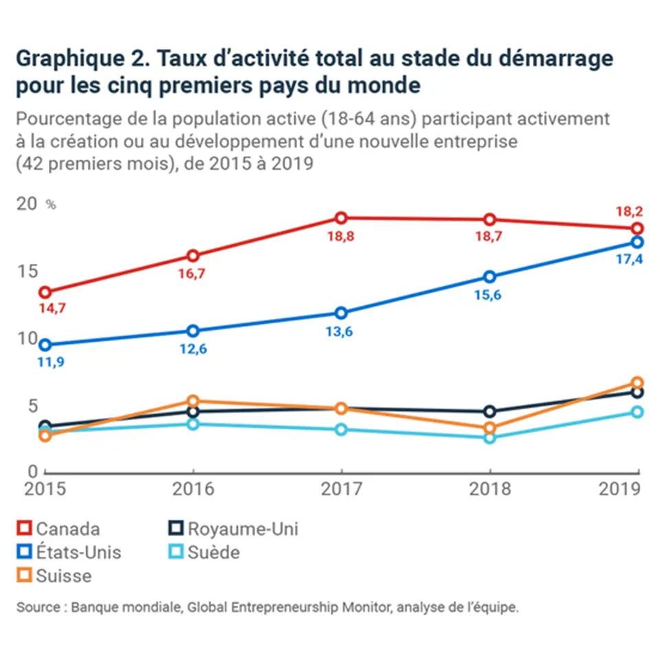 Cette mobilisation, combinée à d’autres efforts visant à favoriser la création d’entreprises, a permis au Canada d’enregistrer, chaque année depuis 2015, le taux le plus élevé d’entreprises au stade du démarrage parmi les principaux pays développés (graphique 2).