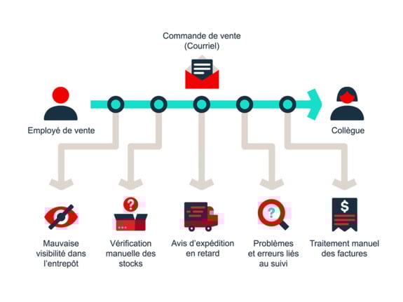 Imaginons un scénario. Vous travaillez dans l’équipe des ventes et vous créez une commande, puis vous l’envoyez par courriel à une collègue. Celle-ci saisit les données dans le système comptable pour créer une facture. À partir de cette étape, d’autres inefficacités peuvent survenir: