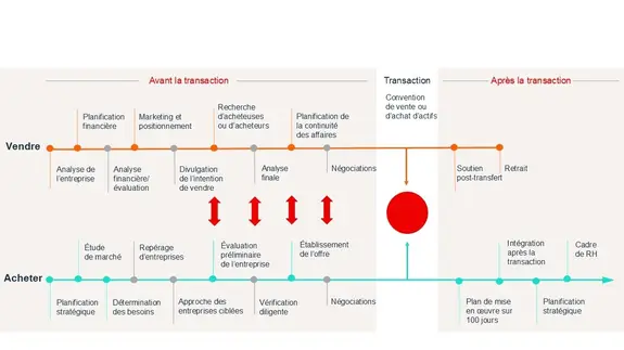 Cette illustration montre les étapes clés que les acheteuses et acheteurs ainsi que les vendeuses et vendeurs doivent suivre avant et après la transaction (qui est représentée par le gros rond rouge). Les deux parties ont des tâches importantes à faire avant la vente, et ces étapes sont suivies d’une phase d’intégration. Même si un plan d’intégration solide est essentiel, ce que vous faites avant que la transaction soit finalisée l’est tout autant.