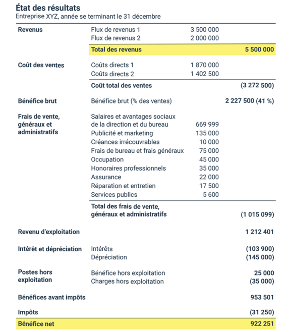 Ces montants sont habituellement tirés de l’état des résultats de fin d’exercice ou de l’avis de cotisation des autorités fiscales. Vous pouvez également faire des calculs intermédiaires tout au long de l’année (par exemple, sur une base mensuelle) pour surveiller la performance financière de votre entreprise, en vous assurant cependant de faire les ajustements nécessaires pour tenir compte de la dépréciation, de l’amortissement, des frais d’intérêt et des impôts. Dans ce cas, vous utiliserez un montant d’impôt estimatif pour faire le calcul.