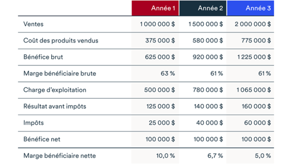Nadine Jaillet donne l’exemple d’une entreprise dont le chiffre d’affaires passe de 1 à 2 millions de dollars par année, tandis que le bénéfice net reste le même, soit 100 000 $. Dans ce cas, la marge bénéficiaire nette a diminué de moitié, passant de 10 % à 5 %.