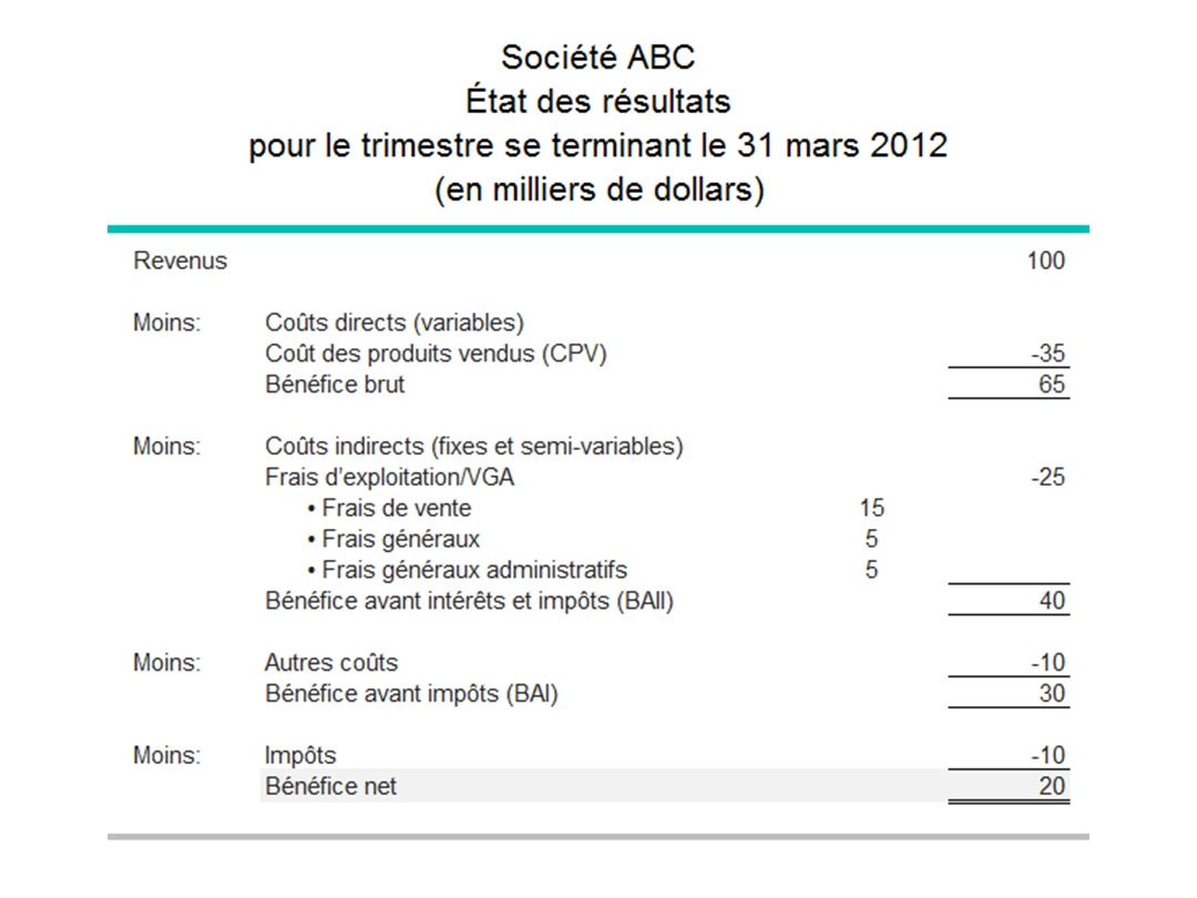 L’état des résultats ci-dessous démontre le bénéfice net d’une entreprise de gros cumulant des revenus de 100 000 $.