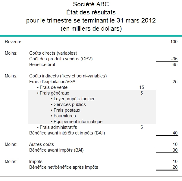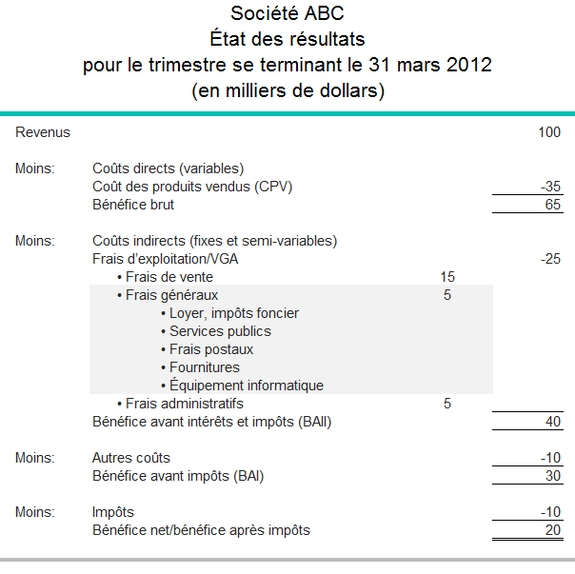 Les catégories de coûts fixes et semi-variables qui constituent les charges indirectes se trouvent dans l’état des résultats ci-dessous, dans la section des coûts indirects.