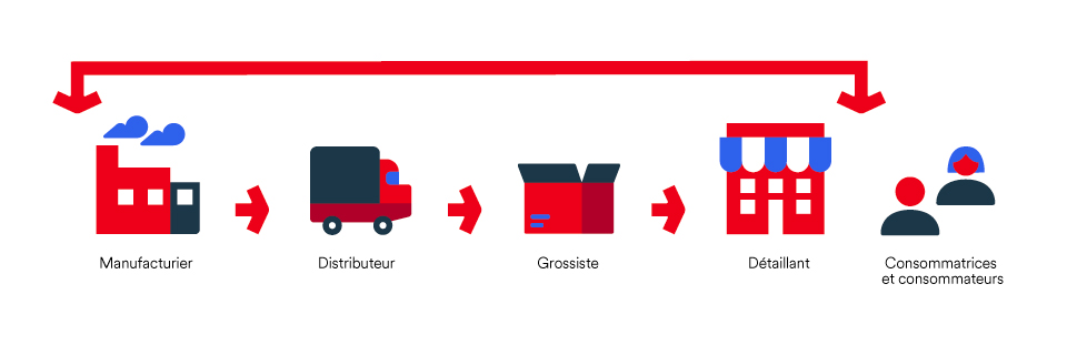 Cette image illustre la chaîne de valeur du commerce interentreprises. La chaîne se termine au détaillant et n’inclut pas les consommatrices et consommateurs.